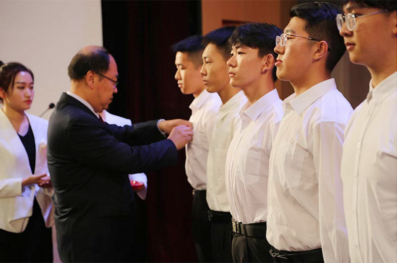 河北大学党委常委、副校长孟庆瑜为新生代表依次佩戴校徽,祝贺他们成为河北大学一员,愿他们秉承“实事求是”校训, 恪守“博学、求真、惟恒、创新”的校风精神,刻苦钻研,学有所成。