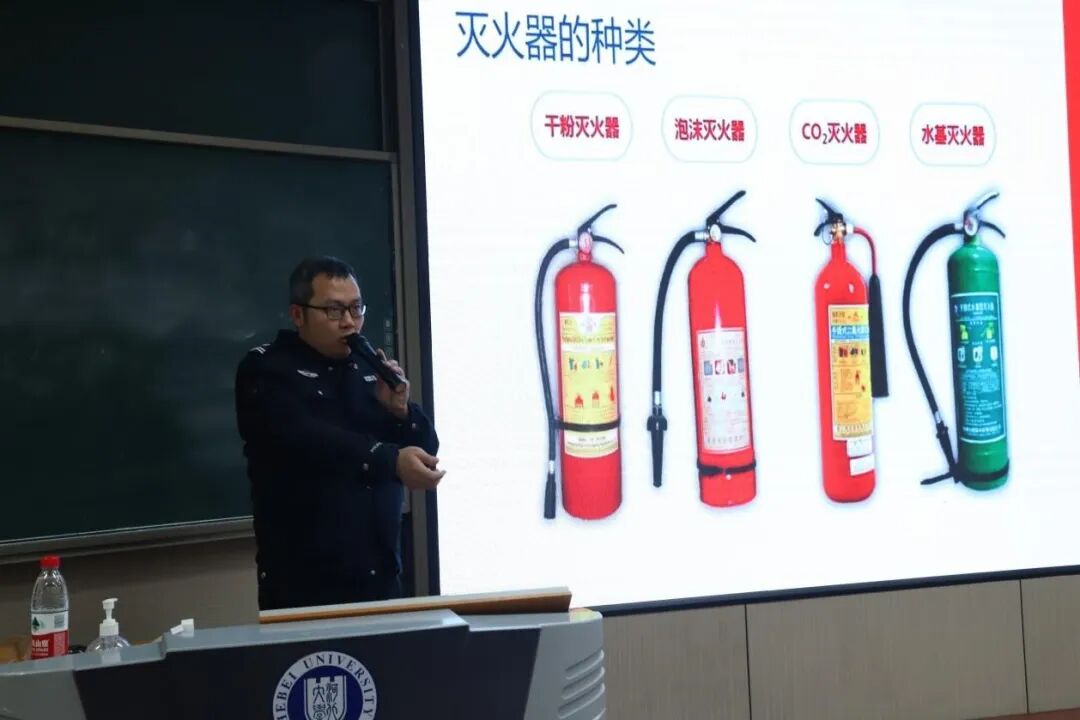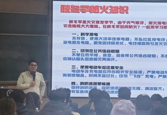 活动伊始,李昊辰老师结合近年来高校典型火灾案例,以图文并茂、案例剖析的方式,从消防安全隐患排查、初起火灾处置、火场科学逃生三个方面展开系统讲解。他总结提炼出 “防、灭、逃” 三字工作法,通过案例剖析与原理阐释相结合的方式,深刻印证“隐患险于明火,防范胜于救灾,责任重于泰山”的安全理念,为在场师生上了一堂兼具警示性与指导性的消防安全教育课。