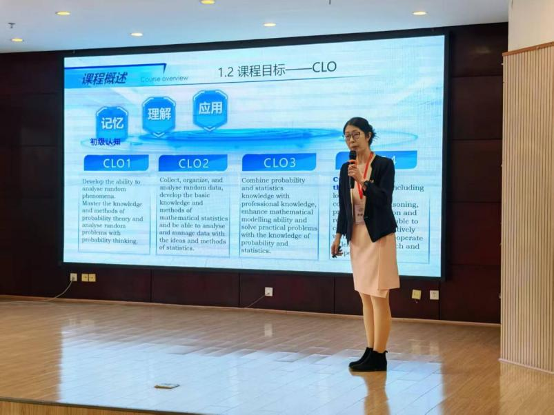 决赛现场,顾芳老师以《明辨为线 贯穿全程-概率论与数理统计智慧课堂构建与实践》为汇报主题,系统陈述了从教学目标的重构入手,以学生为中心,以教学为导向,将“价值塑造、知识传授、能力培养”融合,利用任务引擎、案例驱动、AI实践、分组任务四大教学路径构建三维思辨课堂,将明辨性思维和思政元素融入教学每一个环节。