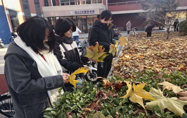 在活动期间,同学们纷纷走出宿舍,在校园的林荫道、草坪间寻觅心仪的落叶。落叶成为联系同学们和自然的媒介。同学们专注收集形态完整的叶片,每一片叶子都承载着大家对秋日校园的独特观察与喜爱。
