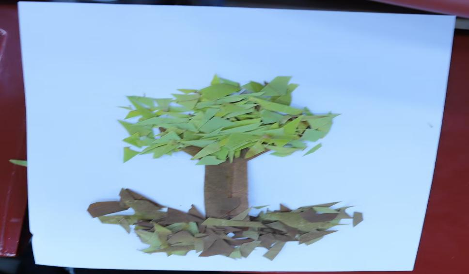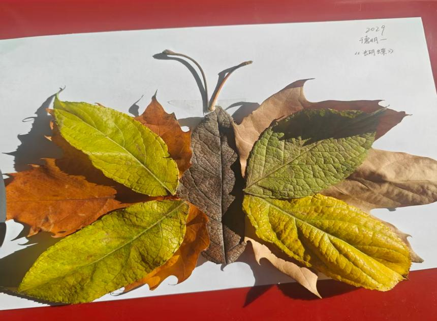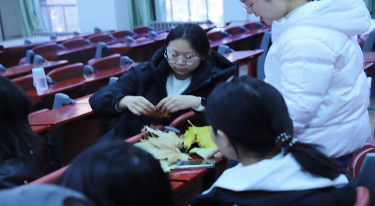活动现场,各位同学们分工协作、创意迸发。大家围坐在一起,将收集来的落叶铺平、修剪,相互交流想法、分享技巧。原本看似普通的落叶,在大家的巧思与巧手之下,变成了一件件充满创意与温度的手工作品。整个教室里充满了欢声笑语。