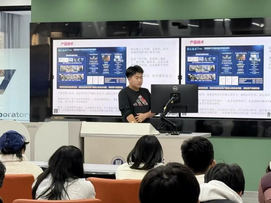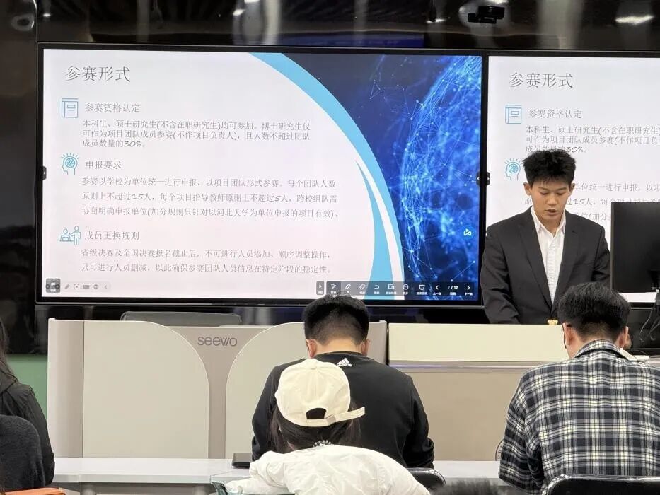 在经验分享环节,王译甜、张子轩两位同学结合自身参赛经历,毫无保留地分享了宝贵经验。在选题阶段,要立足实际需求,避开同质化竞争,聚焦具体问题探索创新解决方案。在答辩准备阶段,详细讲解了 PPT 逻辑梳理、核心内容呈现及现场应变能力培养的关键技巧,为备赛学子提供了可借鉴、可操作的实战经验。